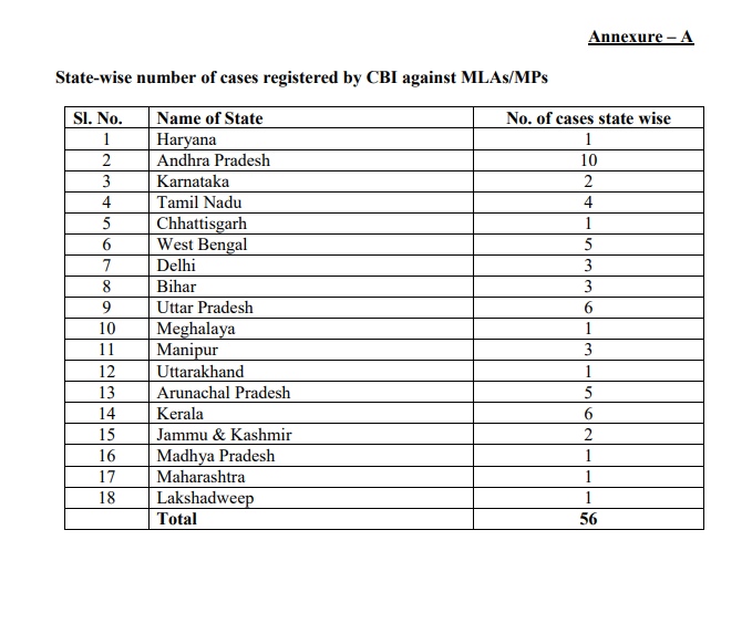 • 56 cases were registered by CBI against MLAs and MPs from 2017 to 2022 (up to 31.10.2022) out of which chargesheet were filed in 22 cases: Department of Personnel & Training (DoPT) in Lok Sabha