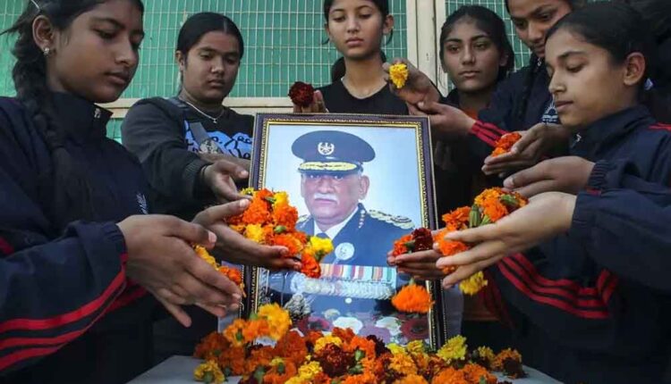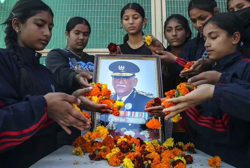 Students pay tribute to late chief of defense staff General Bipin Rawat on his first death anniversary, in Dehradun. General Rawat was killed along with his wife and 11 armed forces personnel in an Indian Air Force (IAF) helicopter crash near Coonoor in Tamil Nadu.
