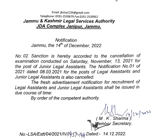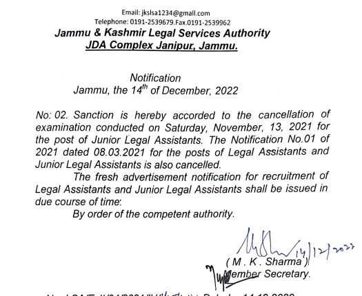 Jammu & Kashmir Legal Services Authority has Cancelled the examination for the post of junior legal assistants which was conducted on November 13, 2021, officials said.