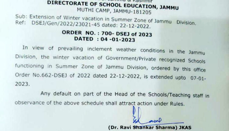 Jammu and Kashmir | Director School Education Jammu extends winter vacations J&K / Ladakh By Editor Last updated Jan 4, 2023 370 Share 370 Share