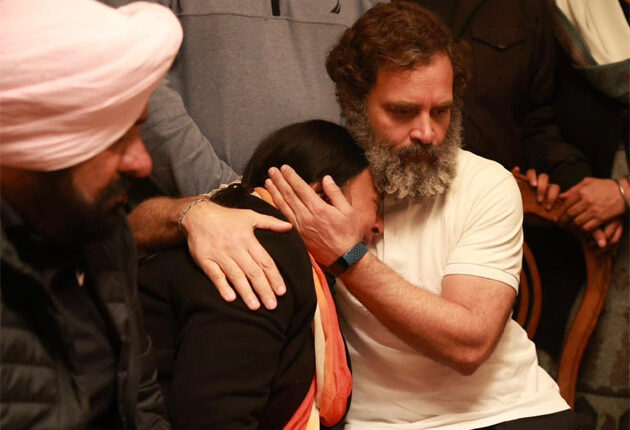 Punjab | Congress MP Rahul Gandhi met the family of party MP Santokh Singh Chaudhary and paid him last respects in Jalandhar. The MP died after collapsing while walking during the Bharat Jodo Yatra in Ludhiana, today.