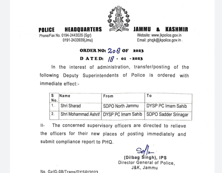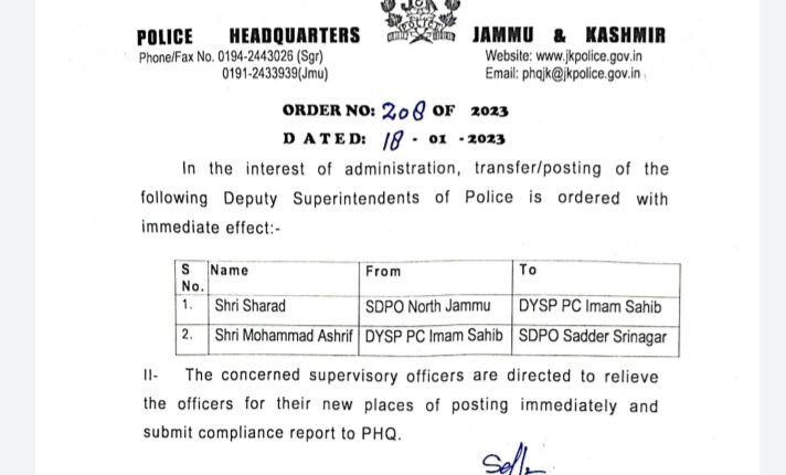 J&K Police orders transfers and postings of DySPs J&K / Ladakh By Editor Last updated Jan 18, 2023 263 Share 263 Share