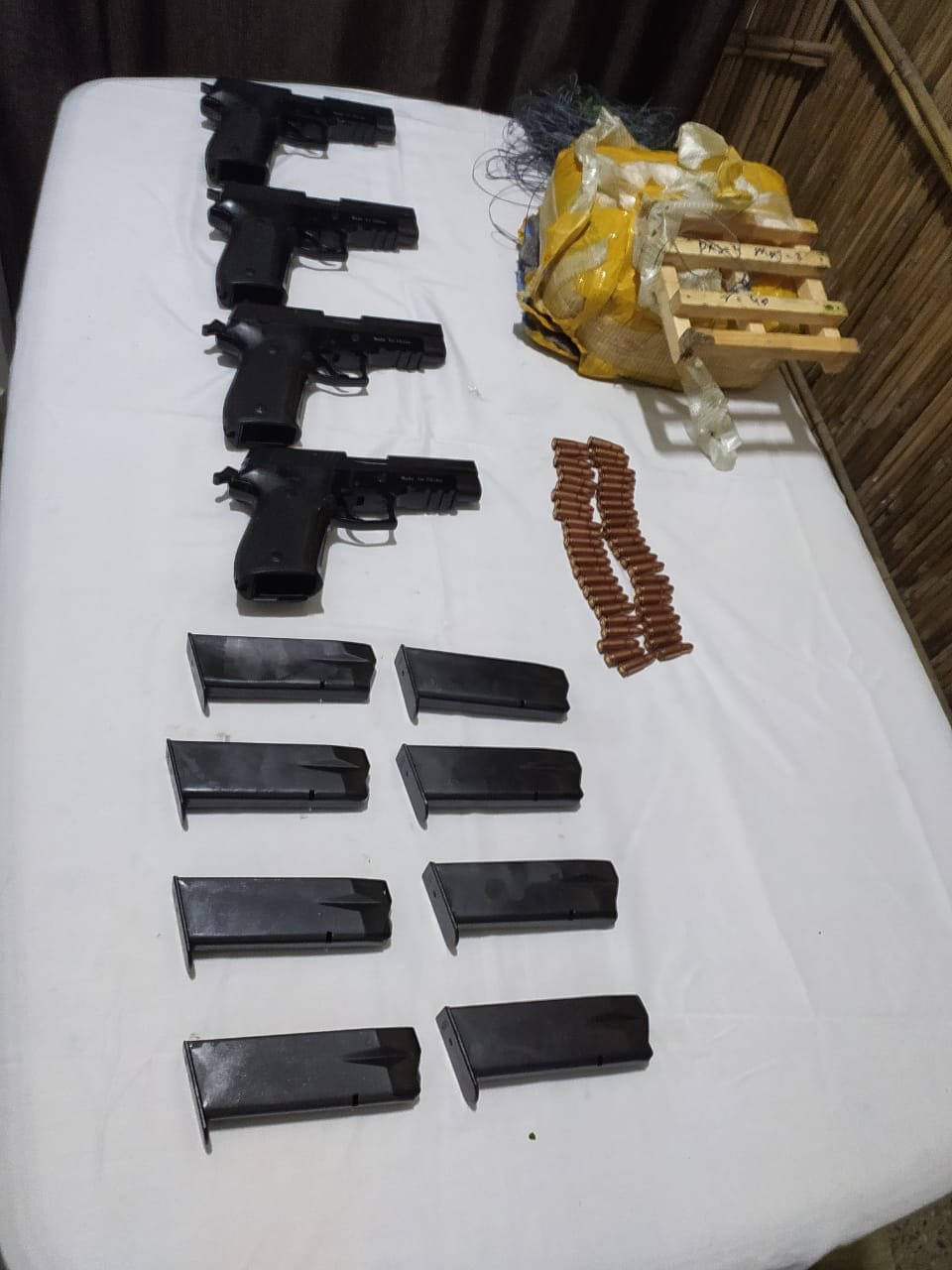 PUNJAB | Last night BSF troops heard humming sound of a suspected drone coming from Pak side & fired on it. During search,a packet was found in Uncha Takala, Gurdaspur. 4 pistols (made in China), 8 magazines & 47 rounds found inside the packet. Search in the area underway: PRO, BSF Punjab