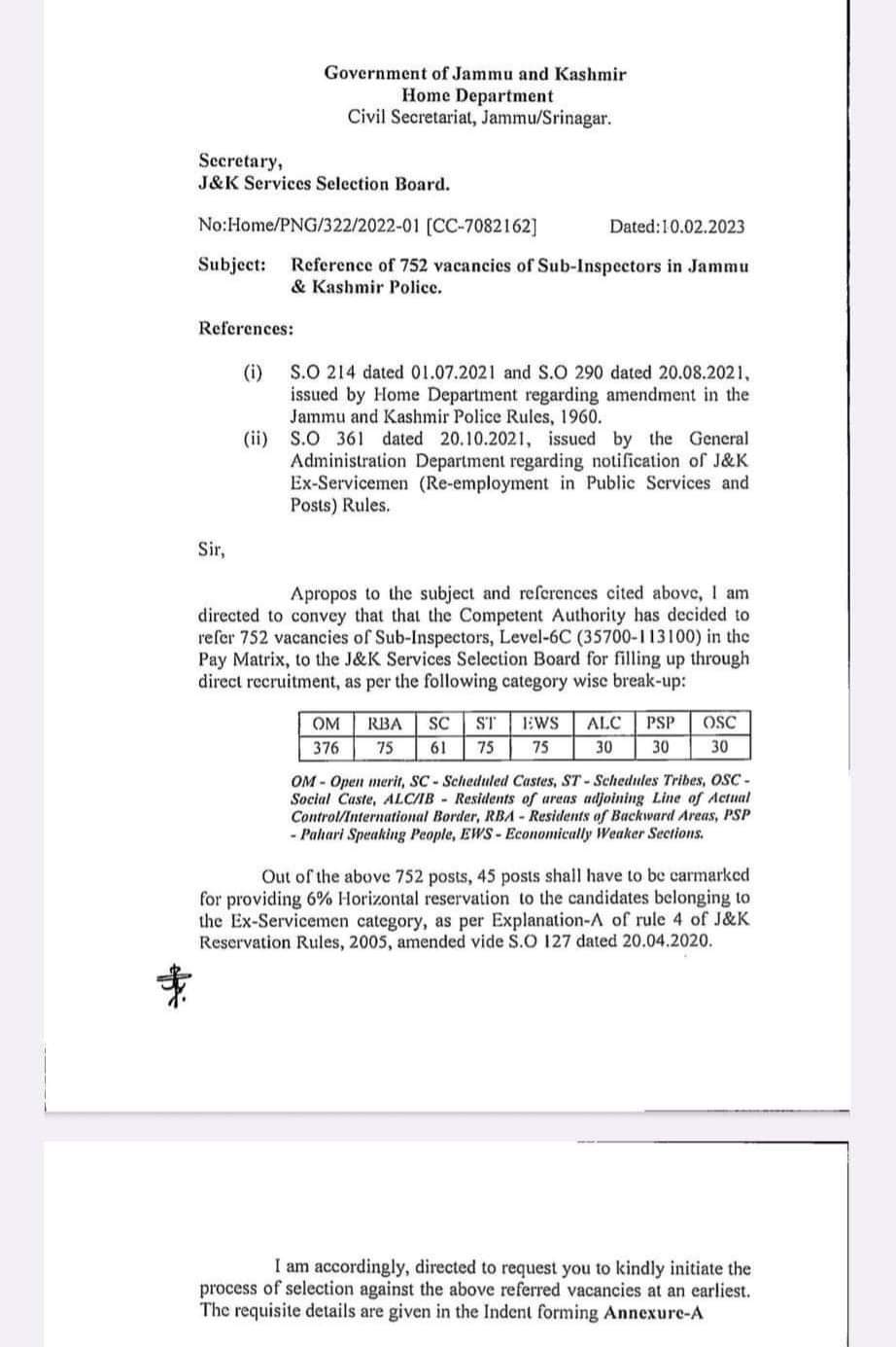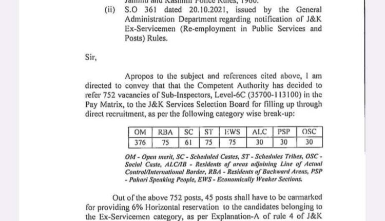 Jammu and Kashmir | 752 more vacancies Of JKP SIs referred to Jammu and Kashmir Service Selection Board (JKSSB). J&K / Ladakh By Editor Last updated Feb 10, 2023 263 Share 263 Share