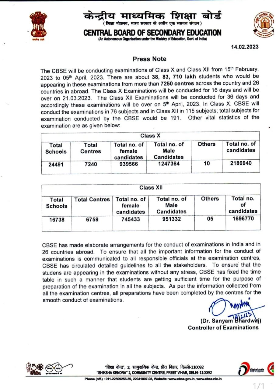 CBSE to conduct examinations of Class 10 and Class 12 from 15th February to 05th April, this year: CBSE Nation By Editor Last updated Feb 14, 2023 342 Share 342 Share