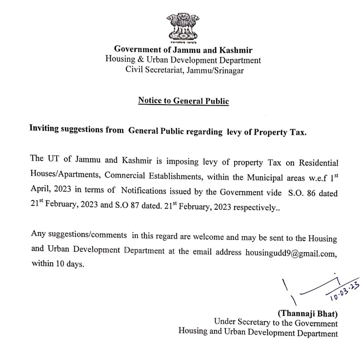 Jammu and Kashmir | Amid increasing resentment against imposition of Property Tax in Jammu & Kashmir, the Union Territory (UT) administration has sought feedback from the public over the proposed tax. J&K / Ladakh By Editor Last updated Mar 12, 2023 604 Share 604 Share