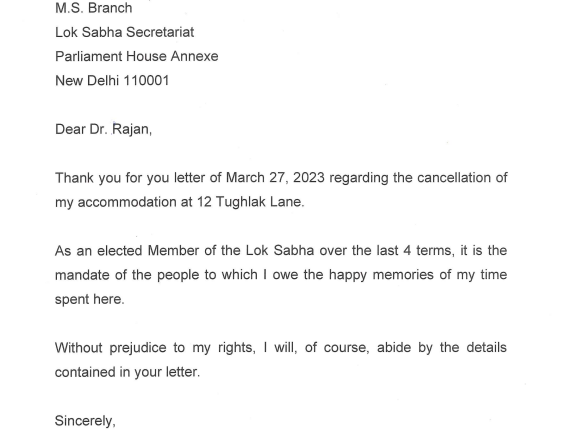 Congress leader Rahul Gandhi writes to Lok Sabha secretariat that without prejudice to his rights, he will abide by the letter that asked him to vacate his 12 Tughlak Lane bungalow.