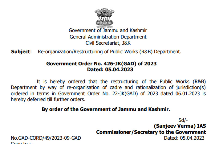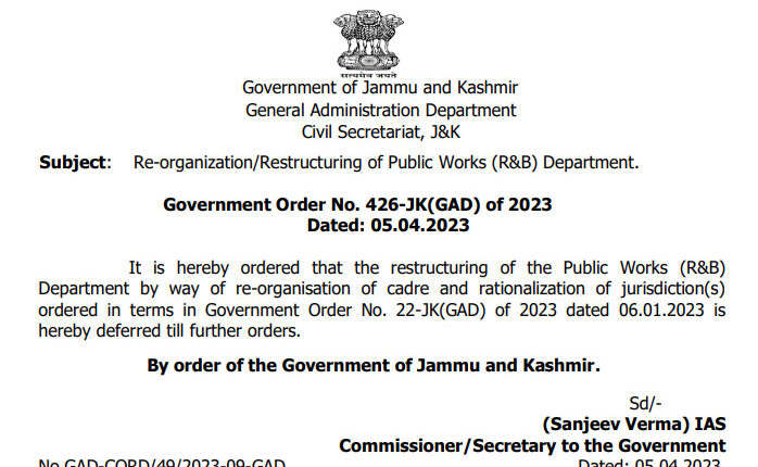 Jammu And Kashmir Govt Defers Restructuring Of Public Works (R&B) Department Till Further Orders