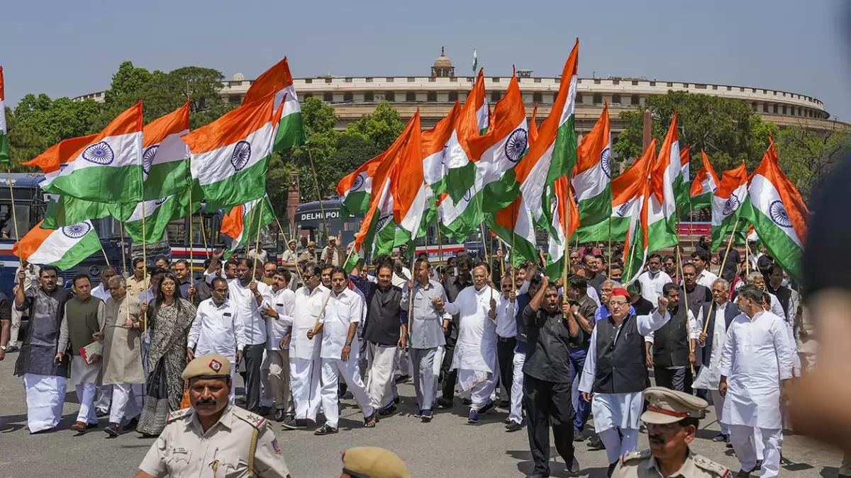 Congress President and Leader of Opposition in Rajya Sabha Mallikarjun Kharge with fellow opposition MPs takes out ‘Tiranga March’ towards Vijay Chowk, on the last day of the Budget session of Parliament, in New Delhi.