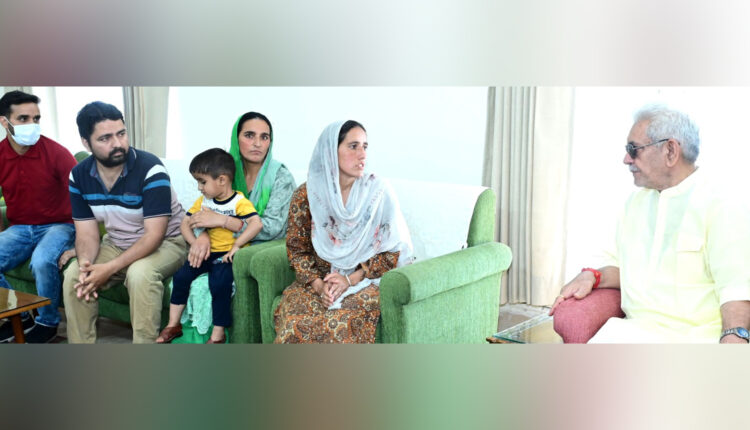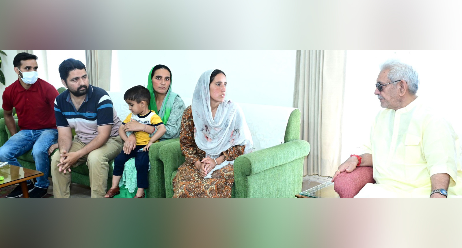 J&K | LG Manoj Sinha met the family members of martyr civilian Sanjay Sharma at Raj Bhawan. Sanjay Sharma was killed by terrorists in Pulwama on 26th February, 2023. J&K / Ladakh By Editor Last updated Apr 6, 2023 305 Share 305 Share