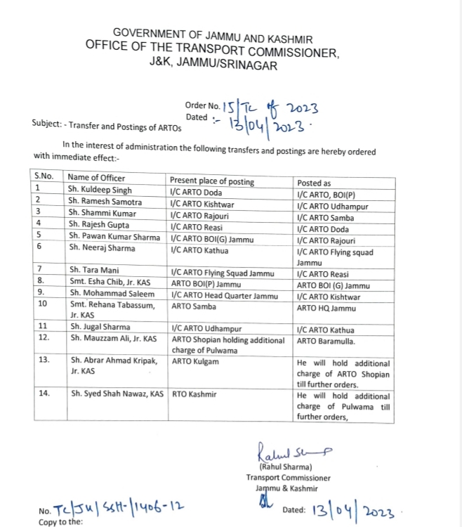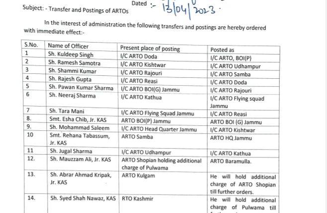 Jammu and Kashmir | Transfer and Postings of ARTOs J&K / Ladakh By Editor Last updated Apr 13, 2023 629 Share 629 Share