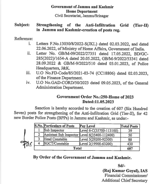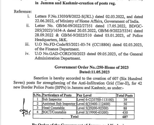 Jammu And Kashmir Government Creates 607 Posts For Strengthening Of Anti-Infiltration Grid (Tier-II) In 42 New Border Police Posts (BPPs) J&K / Ladakh By Editor Last updated May 11, 2023 575 Share 575 Share