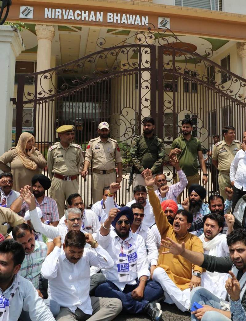 The protest, led by Taranjit Singh Tony, Chairman Aam Aadmi Party (AAP) Jammu and Kashmir for Administrative Engagement and Minority Affairs, and DDC Member Suchetgarh and Yaspal Kundal, Chairman ST, SC OBC Aam Aadmi Party (AAP) Jammu and Kashmir and former minister was held outside Nirvachan Bhawan in Jammu.