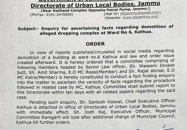 J&K | Enquiry For Ascertaining Facts Regarding Demolition Of Alleged Dropping Complex At Ward No.6, Kathua J&K / Ladakh By Editor Last updated Jun 5, 2023 394 Share 394 Share