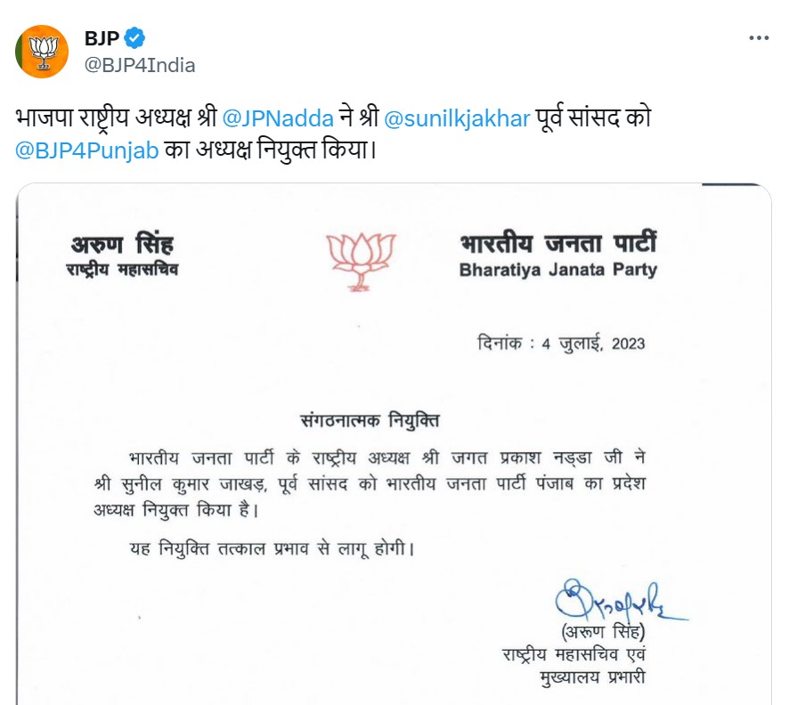 BJP president JP Nadda appoints Sunil Jakhar as state president of party’s Punjab unit. Nation By Editor Last updated Jul 4, 2023 157 Share 157 Share