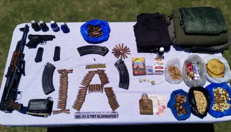 Major war like stores recovered, include one AK 47 Rifle, three AK Magazines with 175 Rounds, one 9 mm Pistol, two Magazines with 15 Rounds, Four Hand Grenades, communication equipment, large quantity of eatables and clothing for sustenance.