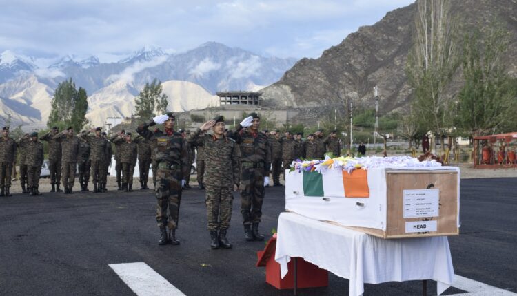 LADAKH | In a solemn wreath-laying ceremony, GOC Fire and Fury Corps & all ranks paid homage with full Military Honours to Braveheart Capt Anshuman Singh, on his final journey, who made the supreme sacrifice in the line of duty at Siachen Sector on 19 July 23