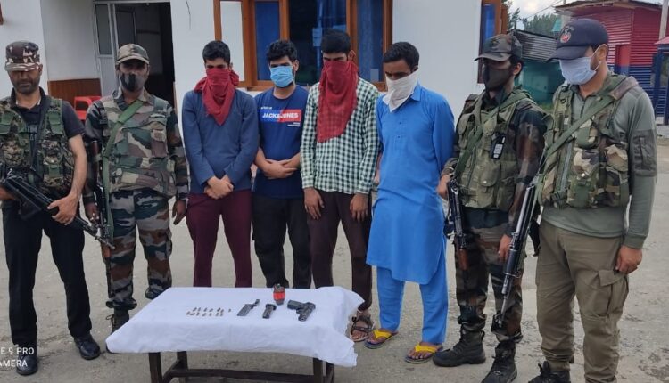 Jammu and Kashmir | Kulgam Police along with 1RR busts grenade throwing terror module, Four accused arrested identified as Nasir Nabi Dar R/o Gundchahal, Aaqib Majid Ganie R/o Badroo, Mohd Abass Dar R/o Gundchahal and Zahid Ali Bhat R/o Kokergund arms and ammunition recovered from their possession.