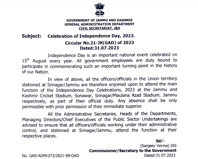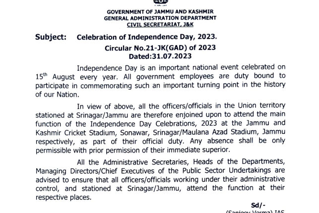 Jammu And Kashmir Govt Asks All Its Employees To Attend I-Day Functions In As Part Of Duty J&K / Ladakh By Editor Last updated Jul 31, 2023 309 Share 309 Share