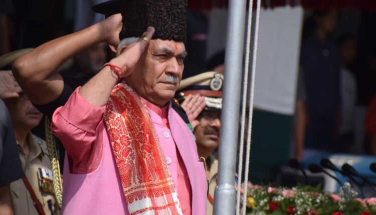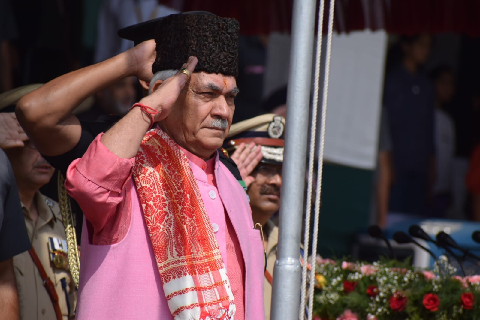 Jammu and Kashmir | Lt Guv Manoj Sinha Takes Salute, Unfurls Tricolor On Eve Of 77th Independence Day At Bakshi Stadium, Srinagar.