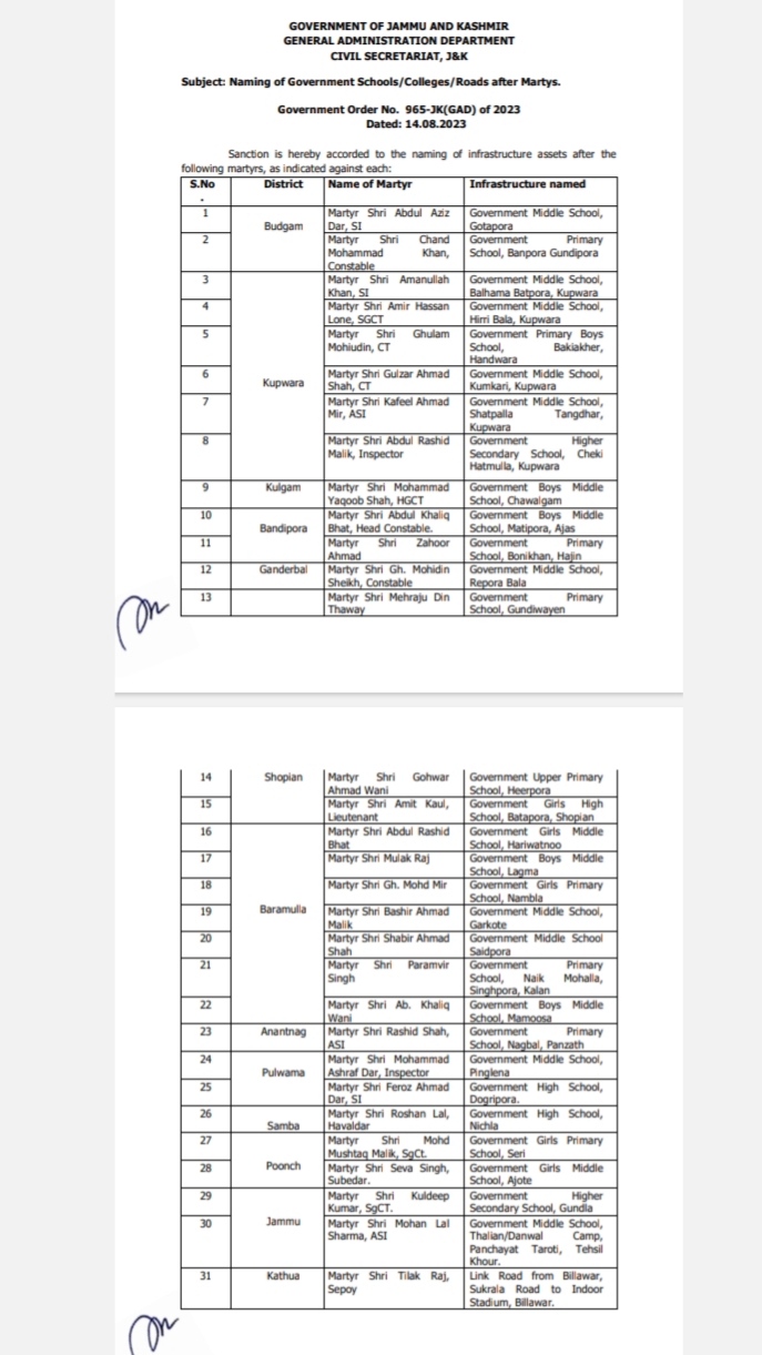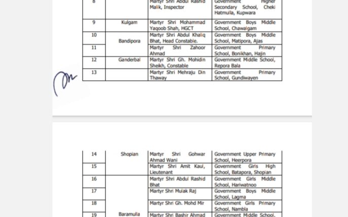 Pertinently, the Government of Jammu and Kashmir has issued an order renaming 31 government schools across Jammu and Kashmir and a link road after the martyrs and eminent personalities
