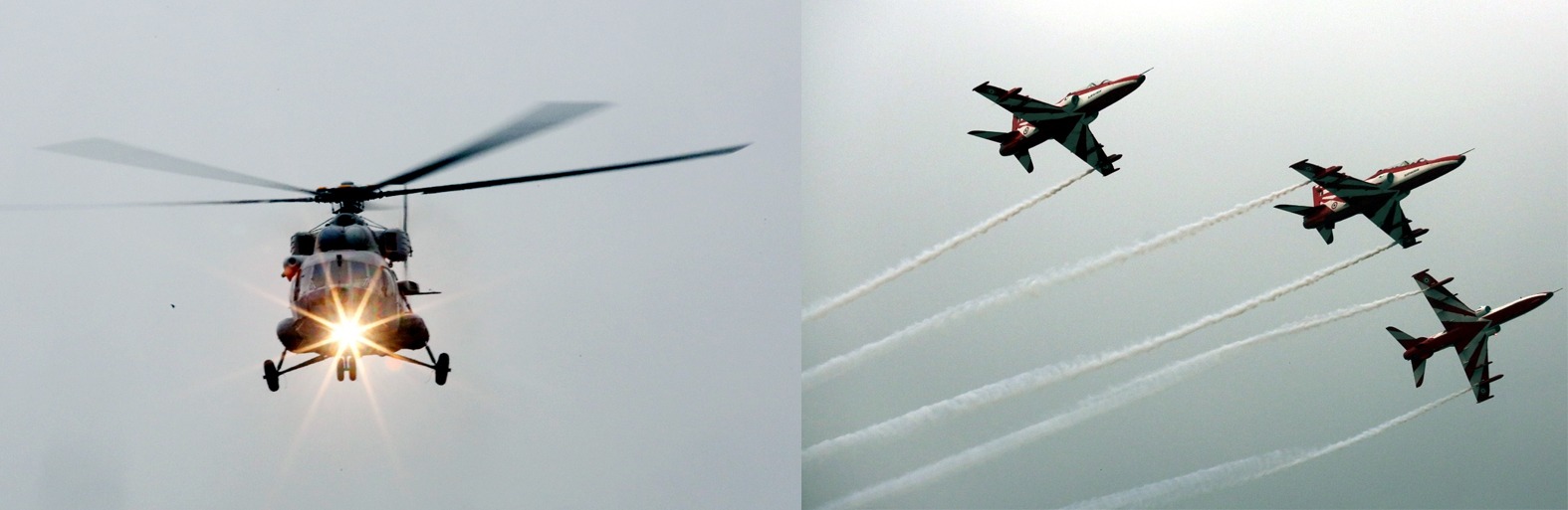 The event began with mesmerizing Free Fall display by Akashganga Daredevil Skydiving Team, who dived with the Indian Flag and the IAF flag, enthralling the huge audience. The touch down of the 14 member Akash Ganga sky diving team of the Indian Air Force was cheered by huge gathering who were enjoying the event in full swing.