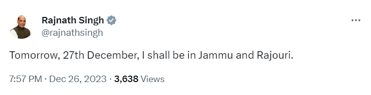Defence Minister Rajnath Singh to visit Jammu and Rajouri on 27th December. J&K / Ladakh By Editor Last updated Dec 26, 2023 73 Share 73 Share