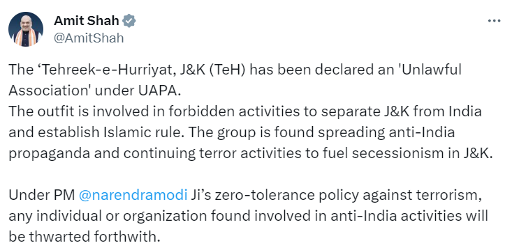 Union Home Minister Amit Shah tweets, “The ‘Tehreek-e-Hurriyat, J&K (TeH) has been declared an ‘Unlawful Association’ under UAPA. The outfit is involved in forbidden activities to separate J&K from India and establish Islamic rule. The group is found spreading anti-India propaganda and continuing terror activities to fuel secessionism in J&K…”