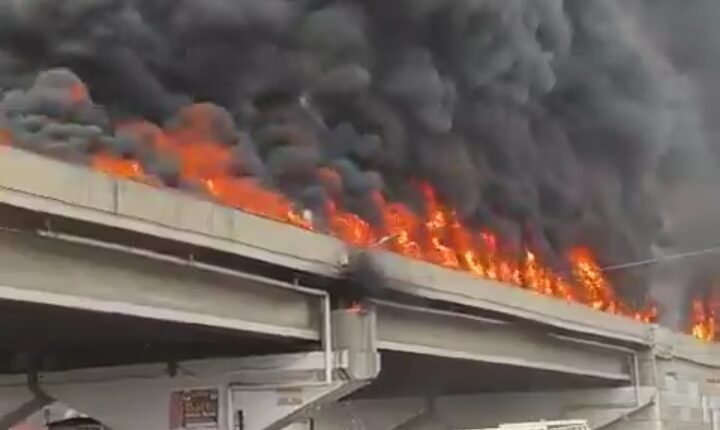 Massive fire at a flyover near Khanna area in Ludhiana district of Punjab after a fuel tank caught on flames.
