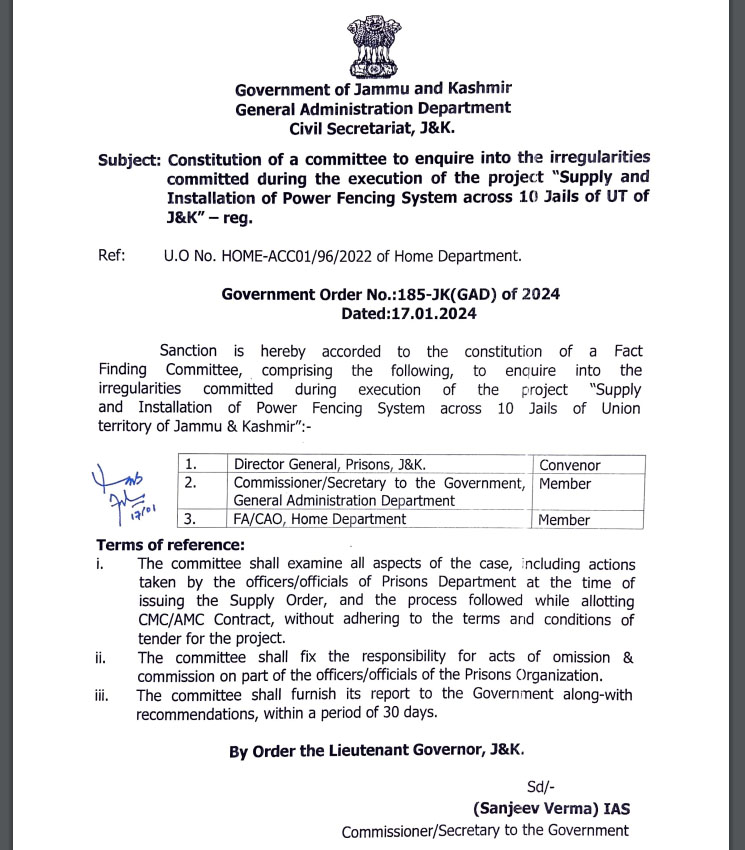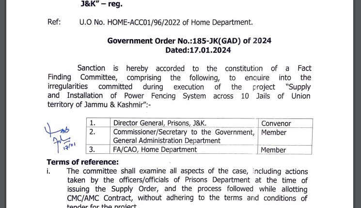 Govt orders constitution of committee to enquire into the irregularities committed during the execution of the project Supply and Installation of Power Fencing System across 10 Jails of UT of J&K. J&K / Ladakh By Editor Last updated Jan 17, 2024 568 Share 568 Share