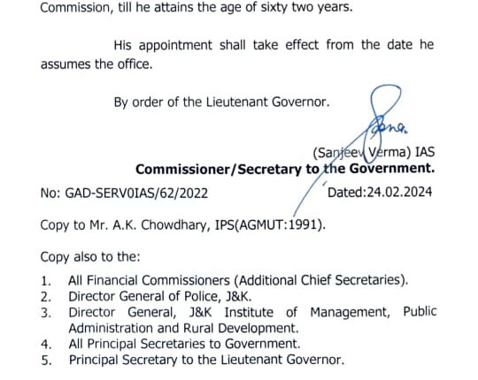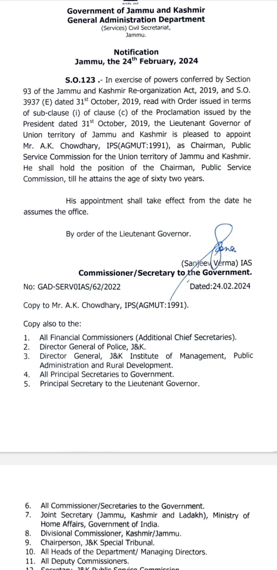 According to a notification issued by the General Administration Department, the Lieutenant Governor has appointed A.K. Chowdhary as chairman PSC.