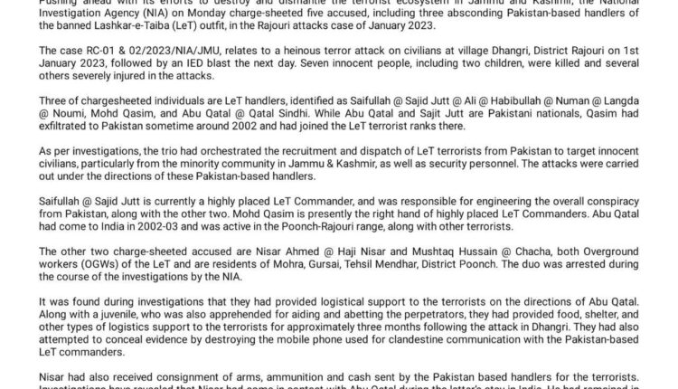 The case RC-01 & 02/2023/NIA/JMU, relates to a heinous terror attack on civilians at village Dhangri, District Rajouri on 1st January 2023, followed by an IED blast the next day. Seven innocent people, including two children, were killed and several others severely injured in the attacks.