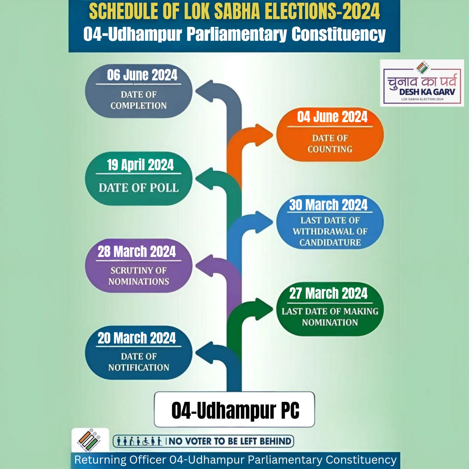J&K | 🗳️ Lok Sabha Elections 2024 Schedule for 04-Udhampur PC: J&K / Ladakh By Editor Last updated Mar 20, 2024 358 Share 🗓️ Notification: March 20, 2024 🗓️ Last Date of Nomination: March 27, 2024 Related Posts HC quashes ED charge sheets against Farooq Abdullah, others… Aug 14, 2024 Notorious criminal Royal Singh arrested Aug 13, 2024 EC has the ‘exclusive right’ to decide schedule for Assembly… Aug 11, 2024 🗓️ Scrutiny of Nominations: March 28, 2024 🗓️ Last Date of Withdrawal: March 30, 2024 🗓️ Polling Day: April 19, 2024 358 Share