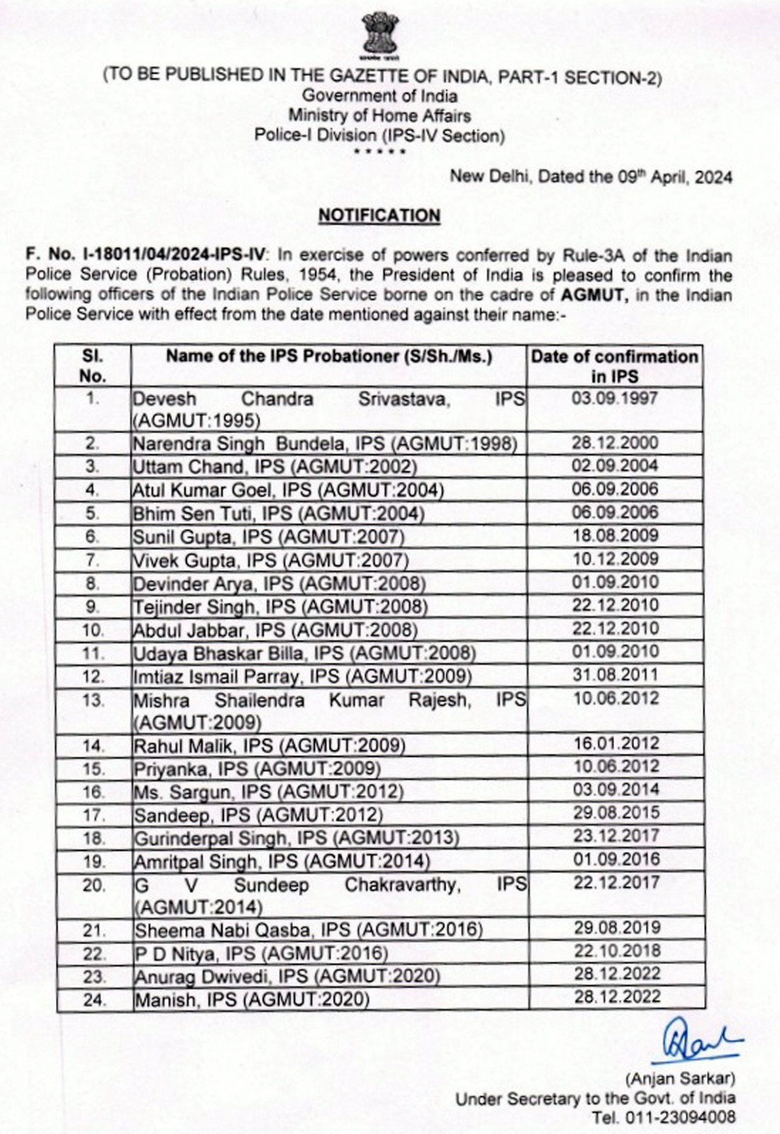President of India has confirmed the following officers of the Indian Police Service borne on the cadre of AGMUT. Nation By Editor Last updated Apr 22, 2024 502 Share 502 Share