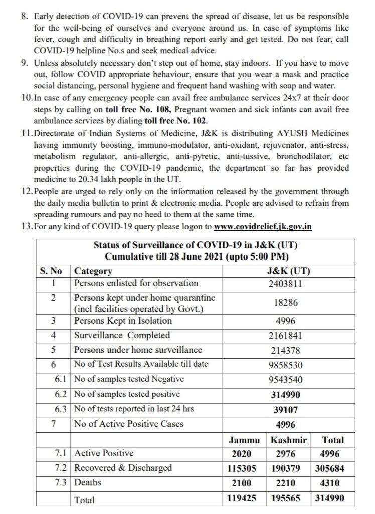 While 90 of the fresh cases were reported from Jammu Division, Kashmir had 169 cases. With this, the number of Covid positive cases in the union territory ever since the beginning of the pandemic last year has risen to 314990. However, of them only 4996 were active positive as the other 305684 people had recovered.