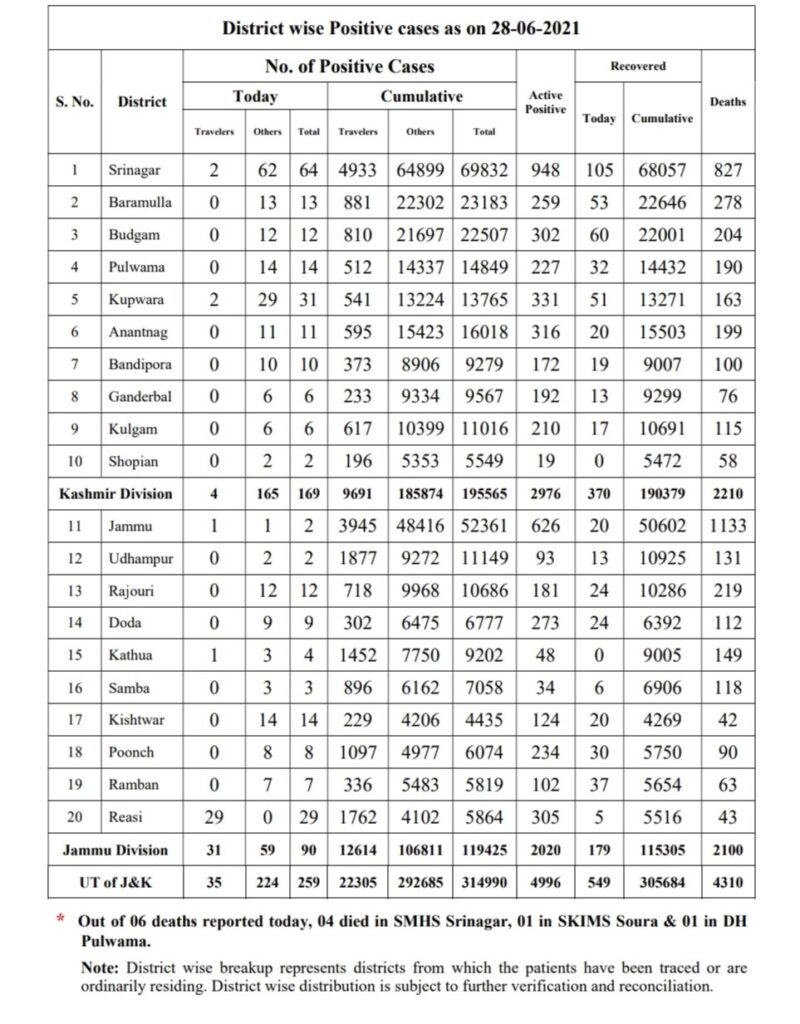 About Corona related deaths, officials said all took place in Kashmir Valley. With this the total number of Corona related deaths in J&K since last year rose to 4310.